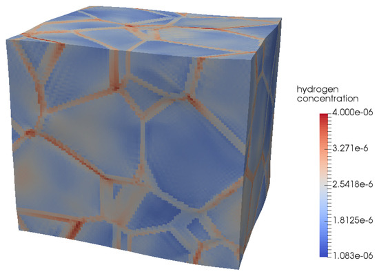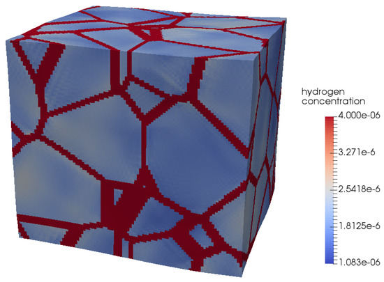 However, the grain boundary fraction we introduce via this scheme is then fixed for a given voxel length, which leads to undesirable effects. When the voxel length is set to m, we obtain a hydrogen concentration profile as shown in Figure 7, corresponding to an estimated grain boundary fraction of ∼10. This scenario shows basically no remaining hydrogen segregation at the dislocations in the grains. To reduce the grain boundary fraction to values that show less dominant hydrogen aggregation at the grain boundaries, a voxel length of about 100 micrometres has to be chosen (see the simulation result obtained for that case in Figure 8). However, in that case, the numerical parametrisation implies a solution of the elastoplastic equations on an undesirably large spatial scale.