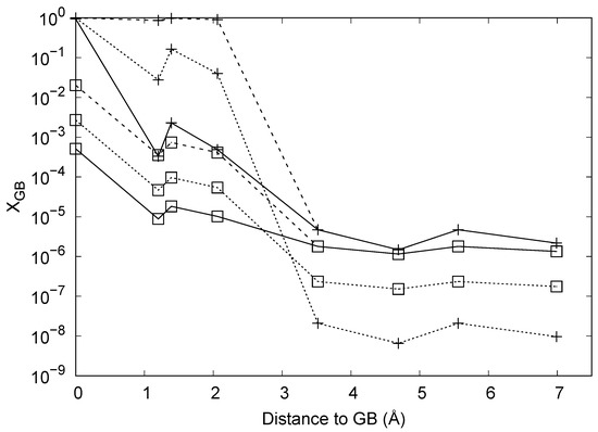 Via the ab initio results from [15], the concentration becomes dependent on the distance to the grain boundary as when r is the distance from the grain boundary, thus