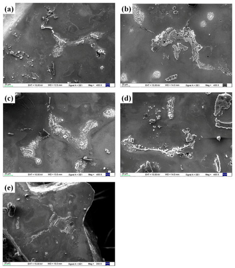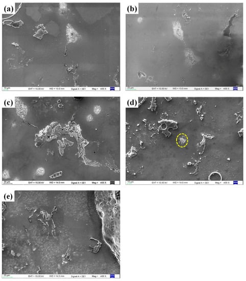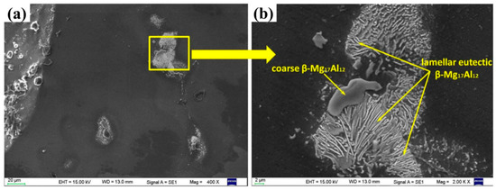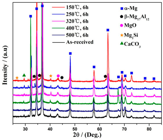 Figure 2 shows the phase composition evolution of the composite foams under different heating conditions. It is clear that there are presently mainly five kinds of phases in all of the foams, that is α-Mg, β-Mg17Al12, MgO, Mg2Si, and CaCO3. The appearance of Mg2Si phase is due to the reaction between CMs and the matrix [8,9,10,13]. CaCO3 is from the undecomposed foaming agent. It can be seen that with the heating temperature increasing the peak intensity of β-Mg17Al12 decreases gradually, meaning that the content decreases. Figure 3 shows the typical morphology of β-Mg17Al12 and it can be seen that β-Mg17Al12 mainly distribute along the grain boundaries (Figure 3a) with the typical morphologies of lamellar β-Mg17Al12 distributes around the bulk β-Mg17Al12 precipitates (Figure 3b) [14,15,16]. It should be underlined that no obvious β-Mg17Al12 phases were observed in traditional AZ31 magnesium foams [17,18,19], and the reasons will be discussed in Section 4. Figure 4 shows the evolution of β-Mg17Al12 at 320 °C, it presents that part of bulk β-Mg17Al12 dissolves as the holding time increasing. As for the lamellar precipitates, part of them also dissolves into the matrix, leading to the content decrease along the grain boundaries. Also, it should not be ignored that β-Mg17Al12 appears in the grain interior. Figure 5 shows the effect of heating temperature on the microstructure evolution of the foams. It can be seen that under lower temperatures (150 °C and 250 °C, Figure 5a,b) dissolution of the β-Mg17Al12 is not evident. While, increasing the temperature to 320 °C, lamellar precipitates start to dissolve (Figure 5c). Further increasing the temperature to 400 °C, the lamellar precipitates almost completely dissolve and the coarse precipitates begin to crack (Figure 5d), and it can be clearly seen that β-Mg17Al12 precipitates completely dissolve when the foams are heated at 500 °C (Figure 5e).