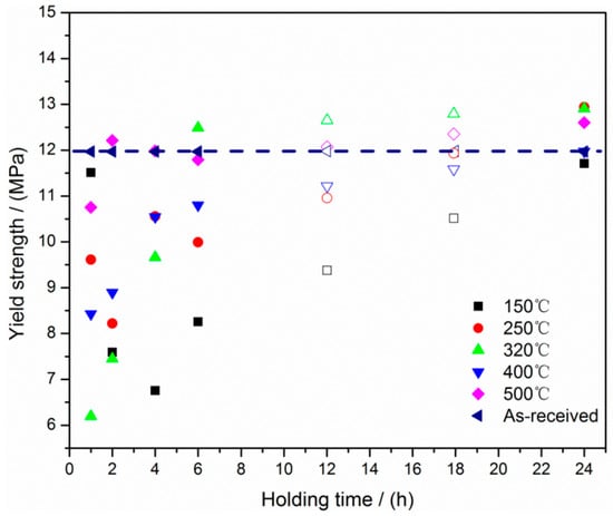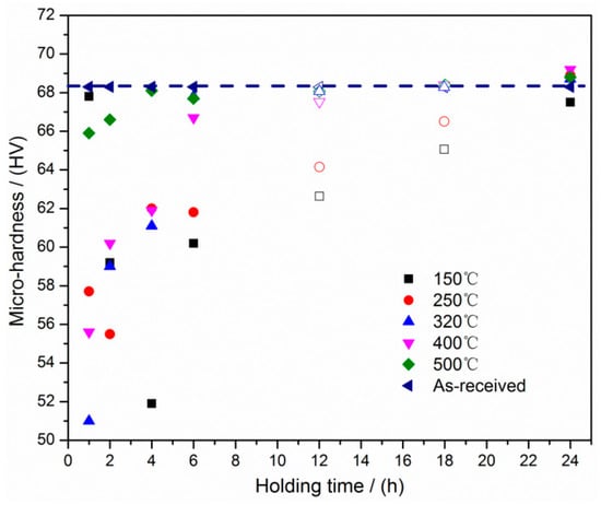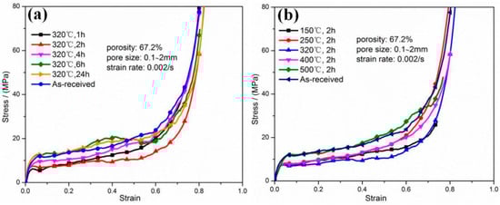 where is material constant, k is the Boltzmann constant, is the activation enthalpy for actual stress relaxation. It can be seen from Equations (4) and (5) that the higher heating temperature (T) or longer holding time (t), the greater relaxation of internal stresses. It has been reported that residual stresses in WC and Co phases decrease with both heating temperature and annealing time increasing, and finally, the residual stresses decline to a very small value that became a stable state [29]. With regard to this work, it can be clearly seen that for the foams heated at 150 °C, the internal stress should be eliminated at 4 h, resulting in the lowest micro-hardness and yield strength. While, for the foams that were heated at 250 °C, the micro-hardness and yield strength decreased to the lowest value at 2 h. Moreover, it was shown from Figure 6 and Figure 8 that the foams heated at 320 °C, 400 °C, and 500 °C possess the lowest micro-hardness and yield strength when the holding time was 1 h. It was obviously indicated that the internal stress was released more efficiently at higher temperature, which was consistent with the reported literature [29,30,31]. While, it is reasonable to infer that the lowest value can be actually yielded with the holding time less than 1 h when the heating temperature is higher than 320 °C.