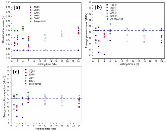 Figure 9a presents the densification strains of the foams treated under different conditions [6]. It is clear that thermal treatment enhances the densification strain of the foams. Mean plateau strength is a unique characteristic of metallic foams [17], and in this work, it is defined as the average stress with the strain from the yield strain to densification strain. Figure 9b shows the mean plateau strength of the foams treated with different temperatures and times. It can be seen that, to majority of the thermal treated foams, mean plateau strength are lower than that of the as-received foams (the dash line). As for the energy absorption capacities of the foams, it can be calculated according to Equation (2), and the results are shown in Figure 9c: