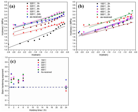 where is true stress, is strength coefficient, is true plastic strain, and is strain hardening exponent. The value of and can be obtained experimentally by plotting the true stress-true strain curves. In log-log scale, a linear relationship should exist between the true stress and the true strain. The exponent corresponds to the angular coefficient of the line [28]. The trend of ln() with ln() and the value of and for the foams heated at 320 °C and 2 h (as representative) are shown in Figure 10a,b, Table 4 and Table 5, meanwhile, Figure 10c shows the strain hardening exponent value of all the related foams. It can be clearly seen from Figure 10c that the strain hardening exponent value for most of the heated foams are higher than the as-received foam. When compared to other foams, the foams that were heated for 24 h possess the lowest strain hardening exponent value.