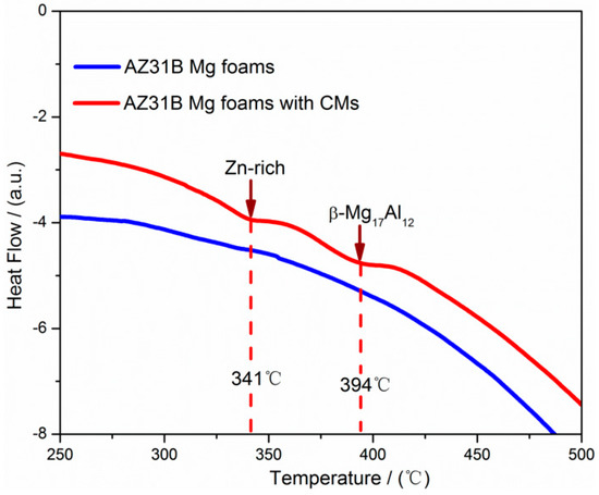 Differential scanning calorimeter (DSC) results of AZ31B foams with and without CMs.