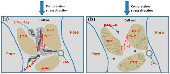 Up to now, the fracture mechanisms of Mg composites with ceramic microspheres are still unclear [8,32,33]. In this work, we mainly focus on the influence of β-Mg17Al12 on the fracture of AZ31 magnesium composite foams, and meanwhile found that the other phases (including CMs) are relatively thermal stable, as described above. It has been proved that the amount, distribution, and morphology of β-Mg17Al12 phase play an important role on crack formation and fracture in AZ series magnesium alloys [34]. In addition, it has been confirmed that Mg/Mg17Al12 interface often acted as crack initiation sources, owing to the incompatible crystal structure between Mg (h.c.p. structure) and Mg17Al12 (b.c.c. structure), leading to the deterioration of mechanical properties [14,35,36]. However, when alloys are subjected to some heat treatment, coarse β-Mg17Al12 precipitates distribute along the grain boundaries could be transformed to fine continuous precipitates that distributed in grains, resulting in the enhancement of mechanical properties [14]. In this work, crack initiation process can be sketched, as in Figure 12. For the as-received composite foams, discontinuous β-Mg17Al12 phases distribute along grain boundaries (Figure 12a). During the compression process, the normal stress (F1) and shear stress (F2) exist simultaneously for a single grain. Shear stress will impact the grain boundaries all the time due to the inconsistent orientations between the grains and the compression direction. With the compression stress (F) increasing, the shear stress (F2) increases. Accordingly, the cracks will initiate at the interface of precipitate/grain and ultimately propagate, leading to the fracture of the foams. However, when the foams are heated at different conditions (for example 500 °C, 24 h), β-Mg17Al12 phases are dissolved and are transformed to lath-shaped continuous precipitates that distribute in grains (Figure 12b), and the occurrence probability of cracks significantly decrease, leading to the improved yield strength.