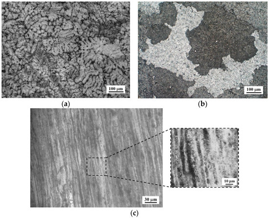 Optical initial microstructure of AZ31-2Ca alloy for different conditions: (a) As-cast; (b) homogenized; and (c) disintegrated melt deposition (DMD) processed-extrusion direction is vertical.