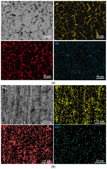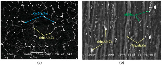 The SEM microstructure of the as-cast AZ31-2Ca alloy is shown in Figure 2a, which shows that two intermetallic phases exist: (1) (Mg,Al)2Ca at the grain boundaries, and (2) Ca2Mg6Zn3 in the matrix. These two phases were also present in the microstructure for CH material. The SEM image obtained on the DMD processed AZ31-2Ca alloy is given in Figure 2b, which reveals (Mg,Al)2Ca particles occurring along bands in the extrusion direction and distributed as particles. In addition, few Al8Mn5 particles are present randomly in the matrix. The phases present in this AZ31-2Ca alloy are comparable to those reported in the literature [10,12,23,24]. The concentration of applicable elements from SEM-EDS (scanning electron microscope—energy dispersive spectroscopy) mapping of as-cast and DMD-processed AZ31-2Ca alloy is shown in Figure 3a,b, respectively. The elements, Zn and Mn, are distributed uniformly in the matrix, while Ca and Al are concentrated at the grain boundaries.