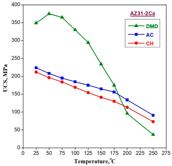 Ultimate compressive strength (UCS) of AZ31-2Ca alloy for DMD processed, as-cast (AC), and cast-homogenized (CH) conditions at different temperatures.