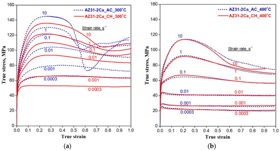True stress—true strain curves obtained on as-cast (AC) and cast-homogenized (CH) specimens at different strain rates at temperatures of (a) 300 °C and (b) 400 °C.