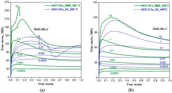 True stress—true strain curves obtained on DMD and AC specimens at different strain rates at temperatures of (a) 300 °C and (b) 400 °C.