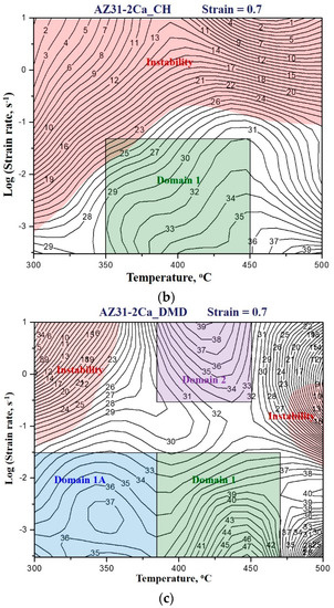 In Equation (2), m is the strain rate sensitivity and is the strain rate. Superimposing this inequality criterion on the power dissipation map delineates the regimes of flow instability and gives a processing map. The map exhibits domains where the workability of a material is optimal, such as dynamic recrystallization (DRX), and regimes of flow instabilities.
