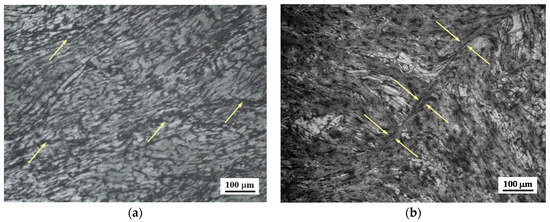 Deformed microstructures obtained in the instability regime of AZ31-2Ca alloy at (a) as-cast alloy at 300 °C/10 s−1, exhibiting flow localization; and (b) DMD processed at 300 °C/1 s−1, showing adiabatic shear band.
