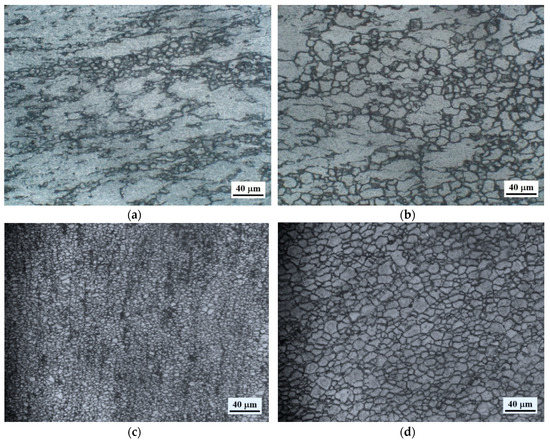 Dynamic recrystallized (DRX) microstructures obtained on as-cast AZ31-2Ca alloy in Domain #1 at (a) 400 °C/0.0003 s−1; (b) 450 °C/0.0003 s−1; and on DMD processed alloy in Domain #1A at (c) 350 °C/0.0003 s−1 and in Domain #1 at (d) 450 °C/0.0003 s−1.