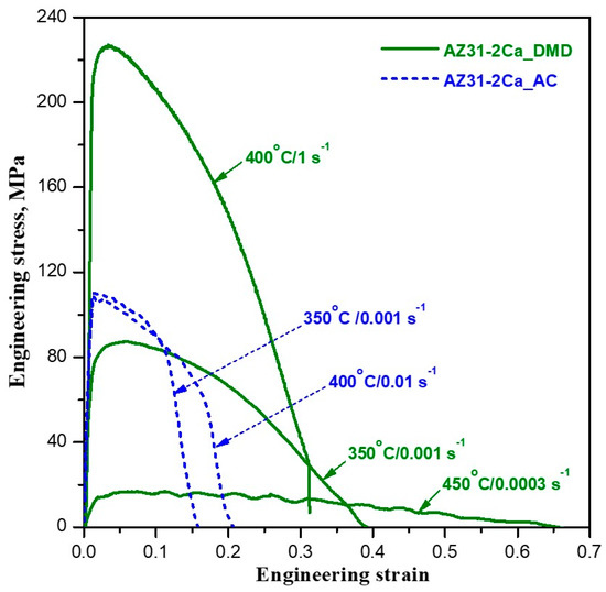 Tensile total elongations have been measured on specimens deformed under conditions within Domain #1 and these were 25% at 350 °C/0.001 s−1 and 33% at 400 °C/0.01 s−1. The engineering stress—engineering strain curves obtained in tension for AC and DMD processed conditions are shown in Figure 10.