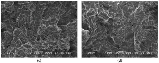 The SEM fractographs taken on the tensile fractured surfaces are shown in Figure 11a,b, respectively, which exhibit dimple features typical of ductile fracture. Thus, the workability in this domain is good and is caused by the occurrence of DRX. At 500 °C and at all strain rates, the AC alloy exhibits intercrystalline fracture (Figure 11c,d), presumably caused by incipient melting at grain boundaries, since the actual temperature of the specimen may increase beyond 500 °C due to deformation heat, particularly at higher strain rates. Homogenization was not helpful in eliminating this effect, but made it less catastrophic.
