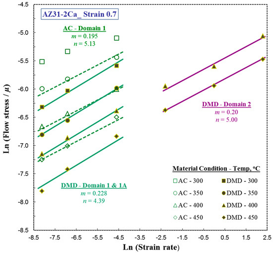 where n, Q, and R, are the stress exponent, apparent activation energy, and gas constant, respectively, and A is a constant. The pre-exponential factor is related to the dislocation density, area slipped, burgers vector, and atomic frequency [26]. A plot of flow stress versus strain rate at different temperatures is shown in Figure 12 and the Arrhenius plot showing the natural logarithm of flow stress, normalized with respect to the shear modulus versus inverse of absolute temperature, is shown in Figure 13. The values of activation parameters obtained are n = 5.13 and Q = 228 kJ/mole from these plots, which are also shown in Table 1. The corresponding values obtained on CH specimens are 4.64 and 198 kJ/mole, which are not significantly different from those obtained in the AC condition. This reiterates the earlier findings that homogenization did not cause perceptible change in the hot working behavior. The apparent activation energy is much higher than that for lattice self-diffusion (135 k/mole) [26], which is a consequence of the large back-stress generated by the intermetallic particles in the microstructure, which must be overcome before cross-slip can occur. Thus, in Domain #1 of the processing map for AC and CH, DRX occurs by second order pyramidal slip, along with cross-slip for recovery. At temperatures higher than 400 °C, other non-basal slip systems, like prismatic and first order pyramidal type, would also be contributing to the deformation, and cross-slip on these systems causes recovery. However, the second-order pyramidal system would be dominating due to the availability of a large number of slip systems and high stacking fault energy (173 mJ m−2) [25].
