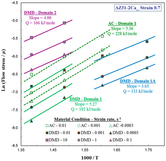 Arrhenius plots obtained on AZ31-2Ca in the processing domains of DMD processed against as-cast alloy.