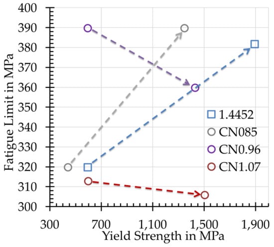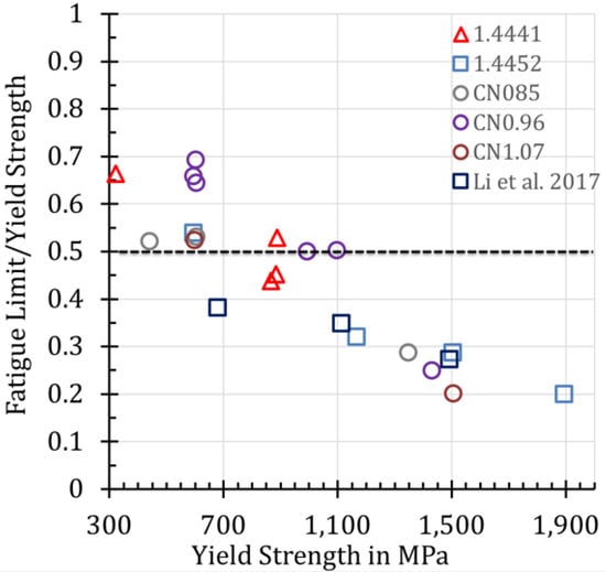 According to empirical relations and thick-thumb rules for wrought austenitic steels, σD should be at minimum 0.5 times of Rp0.2 (Figure 5) [,,,,,,,]. Thus, it is interesting to notice that all solution annealed steels (Rp0.2 < 700 MPa) nearly fulfill this empirical criterion, while for the cold-worked steels, only 1.4441 and CN0.96 do so up to a yield strength of 1100 MPa (Figure 5).