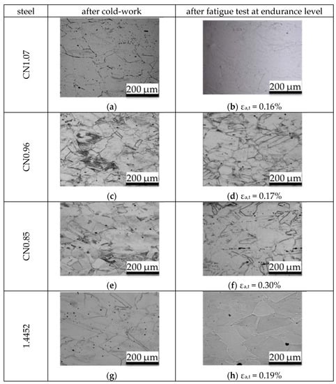 Microstructures of steels after cold-work and after fatigue tests, with information about the total strain amplitude applied at endurance level for N ≥ 2 × 106. (a,b) CN 1.07; (c,d) CN 0.96; (e,f) CN 0.85; (g,h) 1.4452.