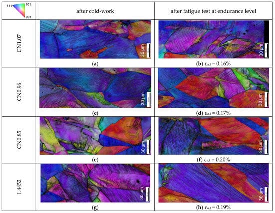 In order to gain better information, EBSD analyses were carried out (Figure 4). Obviously, after cold-working, any strain-induced phase transformations of the austenite into ε-martensite can be ruled out []. Thus, TRIP (transformation induced plasticity) effects did not influence the fatigue behavior.