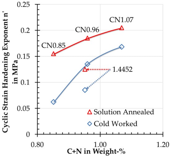 Cyclic strain hardening exponent n’ in relation to the sum of C+N.