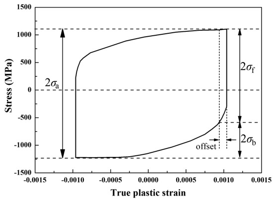 The Cu-Be-Co-Ni alloy after NA and DA treatments presented an excellent linear relationship during the elastic loading and reloading process. Besides, there were large differences between the tension and compression curves [19]. Hence, the KWLC technique [17] was used to calculate the effective and internal stress of the alloy during LCF tests in the present study. As shown in Figure 2, the effective stress (σf) and internal stress (σb) can be directly obtained from the hysteresis loop, where σf is determined at a reversed plastic strain offset of 1.0 × 10−4 as suggested in the literature [14,15,20] and σb can be calculated by σb = σa − σf.
