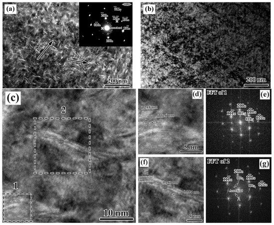 As shown in Figure 3a, the NA alloy mainly contains slender strips of γ′ precipitates. The “arrowheads” could be observed in the corresponding selected area diffraction pattern (SADP), which was considered as the sign of a change in habit planes from the former metastable phase [21]. The slender strips of γ′ precipitates were parallel to and . Unlike slender strips, a striated microstructure was observed in the DA alloy (Figure 3b). From the HRTEM images (Figure 3d,f), the lattice parameters of the precipitates could be measured and then compared with the results from Monzen et al. [22]. The corresponding digital fast Fourier transform (DFFT) patterns of Area 1 (Figure 3e) and Area 2 (Figure 3g) were utilized to further confirm the results from HRTEM images. Consequently, it could be inferred that the precipitates in the DA alloy were composed by γ′I and γI phase.