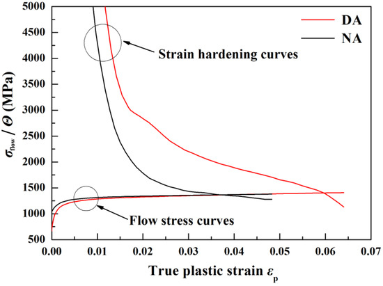 The differences in tensile properties are also reflected in the strain hardening behavior. As shown in Figure 4, the strain hardening behavior is described by the plot of the flow stress (σflow) and instantaneous strain hardening rate (Θ = dσflow/dεp) vs. the true plastic strain (εp). All the strain hardening curves showed an initially very rapid decrease, which was associated with the elastic/plastic transition [23]. After the elastic/plastic transition, the decreasing of strain hardening rate (Θ) slowed down and then followed a linear reduction, which was coincidence with the work hardening behavior of polycrystalline fcc metals described by the Kocks–Mecking–Estrin (KME) model [24,25]. While the Θ decreased with the increase of εp, the σf kept increasing. The necking occurred when these two dependent variables were equal [26]. As shown in Figure 4, the decreasing rate of Θ in the transition section on the strain hardening curve under DA condition was far slower than that under NA condition, leading to a considerable increase of uniform elongation.