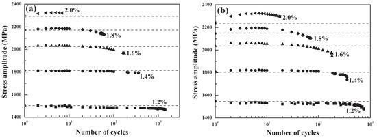 Stress amplitude vs. the number of cycles of the alloy under different aging conditions: (a) NA; and (b) DA.