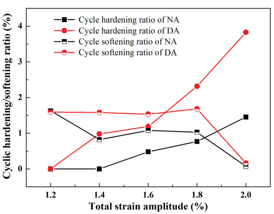 Cyclic hardening ratio (CHR) and cyclic softening ratio (CSR) were frequently utilized to characterize cyclic deformation behaviors of metallic materials. CHR and CSR were determined using CHR = (σmax − σ1)/σ1 and CSR = (σmax − σmid)/σmax, where σ1, σmax and σmid represented the stress amplitude at the first cycle, the maximum stress amplitude and the stress amplitude at the mid-life, respectively [9]. The CHR and CSR results of NA and DA alloys during LCF tests are shown in Figure 6. With the increase of total strain amplitude, the CHR increased while the CSR decreased slowly with a slight change. Under the same total strain amplitude, both the CHR and CSR of the DA alloy were greater than the corresponding value of the NA alloy, which indicated that the stress amplitude of DA alloy varied more apparently during the LCF tests. When the total strain amplitude was greater than 1.6%, the CHR was higher than the CSR under the DA condition. As for the NA condition, the CHR was higher than the CSR only when the total stain amplitude was 2%. Furthermore, the CSR under both aging conditions was almost zero at the total strain amplitude of 2%, indicating that the stress amplitude reached the maximum value at the mid-life.