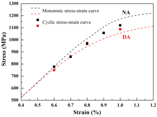 The cyclic stress–strain scatters and the corresponding monotonic stress–strain curves are shown in Figure 7. The cyclic stress and strain correspond to the maximum tensile stress and strain of the hysteresis loops at mid-life. It is seen that the cyclic stress–strain curve is positioned slightly lower than the monotonic one of the NA alloy, while the cyclic curve is higher than the monotonic curve for the DA condition. Therefore, it can be deduced that the cyclic deformation causes cyclic softening for the NA alloy and cyclic hardening for the DA alloy.