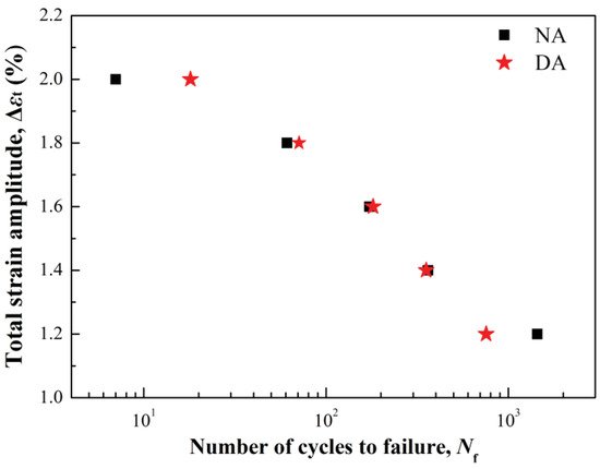 Figure 8 shows the plot of the total strain amplitude and the number of cycles to failure (generally known as ε–N curves) for the NA and DA alloy. It can be found that the fatigue life goes straight down with the increasing of total strain amplitude under both aging conditions. However, the fatigue life of the NA and DA alloy under the same total strain amplitude was different. The fatigue life of the NA alloy was significantly longer than the DA alloy at the relatively low strain amplitude (Δεt = 1.2%), while it reversed at the higher strain amplitude (Δεt = 2.0%).