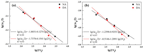In the present study, the value of elastic or plastic strain amplitudes are taken at mid-life from the hysteresis loops since the cyclic stress response behavior tended to be stable at this moment. As shown in Figure 9, the LCF parameters can be obtained through linear regression analysis of the LCF data. The specific value of these parameters is presented in Table 3. It could be seen that all the LCF parameters value of the DA alloy were higher than the corresponding value of the NA alloy, especially for the fatigue ductility coefficient, . The value of the DA alloy was approximately five times higher than that of the NA alloy, suggesting a higher fatigue resistance.