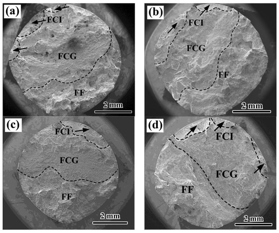 As shown in Figure 10, the overall fracture surfaces can be separated into three stages: (i) fatigue crack initiation (FCI) zone; (ii) fatigue crack growth (FCG) zone; and (iii) final fracture (FF) zone. As indicated by the black arrows, the fatigue cracks initiated basically from the sample surface and multiple FCI sites were observed in all the LCF samples, which was due to the high level of applied stress amplitude. The FF zones were separated from the FCG zones by black dash lines. With the increasing of total strain amplitude, the size of the FF zone on the fracture surface increased. Furthermore, the NA alloy possessed larger size of the propagation zone (area including the FCI and FCG zone) at relatively low total strain amplitude (1.2%), while the propagation zone of the DA alloy was larger at higher total strain amplitude (1.8%). Since the size of the propagation zone on the fracture surface is positively correlated to the cycles required for fatigue crack initiation and propagation, it can be found that the feature of the fatigue fracture surfaces is agreed with the fatigue life results from LCF tests.