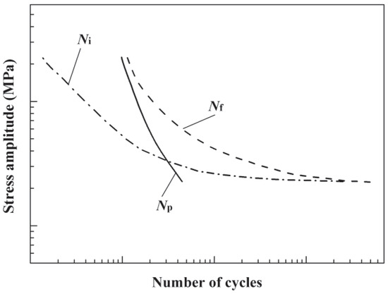 According to Figure 8, the fatigue life of the two aging states alloy increases alternately under various total strain amplitudes. The NA alloy presented a longer fatigue life under relatively low strain amplitudes while DA alloy showed a longer fatigue life when it came to higher strain amplitudes. As shown in Figure 12, the fatigue life (Nf) can be divided into initiation life (Ni) and propagation life (Np), while the proportion of Ni decreases with the increase of stress amplitude [29]. According to Figure 5, the stress amplitude of the alloy increases with the raise of total strain amplitude. Hence, it can be deduced that the proportion of Ni increases with the decreasing of total strain amplitude for both NA and DA alloys.