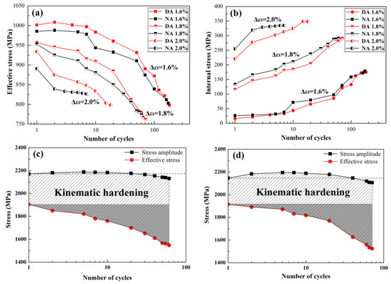 Figure 13a,b shows the evolution of the effective stress and internal stress of the alloy with the number of cycles (N) at different total strain amplitudes. As seen in this figure, the effective stress makes more contribution to the cyclic stress than the internal stress. During the LCF tests, the effective stress of both alloys decreased with the increase of N, while the internal stress increased at first and then became saturated. Despite the similar variation tendency of effective stress and internal stress, the DA alloy presented a higher level of effective stress while the NA alloy possessed larger internal stress under the same total strain amplitude.