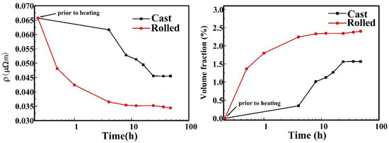 Fe%, Mn%, and Si% are the solute concentrations in wt. %. Mn and Fe solutes significantly affect electrical resistivity, while the contribution of Si solutes is minor. The electrical resistivity of the as-cast and as-rolled samples prior to heating is similar (Figure 1a), indicating that the influence of plastic deformation on electrical resistivity is minor compared to the influence of solutes. Thus, electrical resistivity could be used to indicate the precipitation. The electrical resistivity of the rolled samples decreases rapidly at the early stage of heating (<5 h), and becomes almost stable afterward (Figure 1a). The electrical resistivity of as-cast samples decreases slowly until heated for 24 h. The rapid decrease in the electrical resistivity of the rolled sample heated for short time suggests that plastic deformation promotes precipitation kinetics. Neglecting the minor contribution of Si on electrical resistivity, the volume fraction of dispersoids fp can be estimated by [5]: