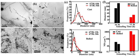 The transmission electron microscope (TEM) bright field images of dispersoids precipitated during heating at 400 °C: as-cast sample heated for 16 h (a) and for 36 h (b); rolled sample heated for 12 h (c) and for 36 h (d), with the corresponding size distributions (e); and (f) the mean diameter and calculated number density per unit volume (ND) of dispersoids.