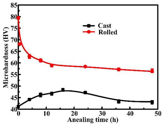 The microhardness evolution of the as-cast and rolled alloys during heating at 400 °C.