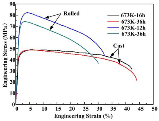 The engineering stress-strain curves at 300 °C of the as-cast and rolled alloys after thermal holding at 400 °C.