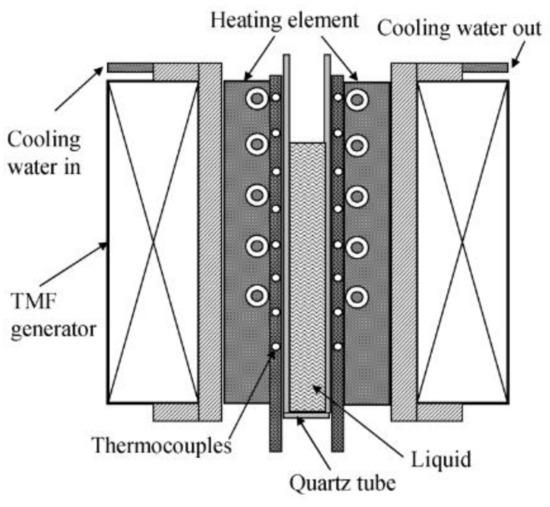 The schematic illustration of the experimental apparatus is shown in Figure 1. The traveling magnetic field was created by means of applying out-of-phase alternating current (AC) currents (50 Hz) to six coils with a star arrangement connected vertically one upon the other. As a result, a downward meridional traveling Lorentz magnetic field was induced in the sample melt. This technique has already been detailed in previous work [15]. A nonmagnetic stainless-steel frame was designed and assembled to hold the sample firmly. The sample had a diameter of 3.5 mm and a length of 100 mm and was placed in a quartz tube fixed in the center of the cavity. The nonmagnetic stainless-steel frame, which allowed water to stream in and out, was installed and thus enabled the equipment to control the cooling rate by adjusting the flow rate of the streaming water. An electric heating furnace was used to heat and melt the sample. The furnace was removed through the opening of the upper cylinder when the TMF generator was applied.
