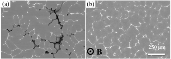 In order to determine the effect of magnetic flux density on the volume fraction and morphology of the micro-pores, Al-alloy samples were solidified in the TMF with various magnetic flux densities. Figure 2 shows the typical microstructures formed without TMF treatment (Figure 2a) and with 48 mT TMF treatment (Figure 2b). The microstructure was composed of primary dendrites and white Al-Al2Cu eutectic phase. It is evident that micro-pores (dark regions) were present in the interstices between the primary dendrites in the sample without TMF treatment, and shrinkage porosity appears as isolated holes, both of which indicated that feeding without TMF treatment in the densely packed dendrite arms was very difficult. For comparison, the micro-pores were inhibited significantly after TMF treatment, as shown in Figure 2b, suggesting that the TMF has a significant effect on reducing the porosity defects.