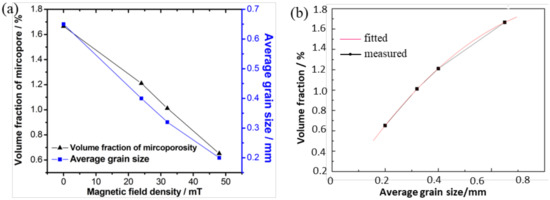 (a) The effect of TMF on the micro-pore fraction and grain size in Al-alloy solidified under different magnetic flux conditions; (b) result showing the relationship between the volume fraction of the micro-pore and the average primary grain size.