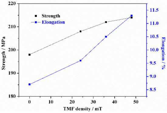 Due to the decreased micro-pores, the mechanical properties of the alloys under TMF were enhanced and the tensile results are shown in Figure 6. For example, the tensile strength and elongation of the alloy increased with the increasing TMF intensity. The optimal mechanical properties (strength of 214 MPa, elongation of 11.3%, increased by 8.0% and 29.9%, respectively, as compared with the samples without TMF treatment) were obtained in the Al alloy treated with 48 mT TMF. Under a tensile loading condition, cracks would be initiated from the weak position, that is, micro-pores, resulting in an early failure of the sample when a number of pores are present in the material. The small grains present in the materials also leads to a greater strength and better elongation. This also suggests that the effect of TMF has a positive effect on improving the mechanical properties. Therefore, TMF treating is a promising method to improve the microstructure and mechanical properties of the casting Al alloys.