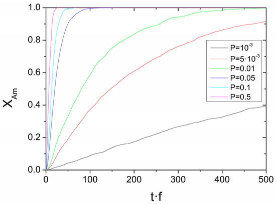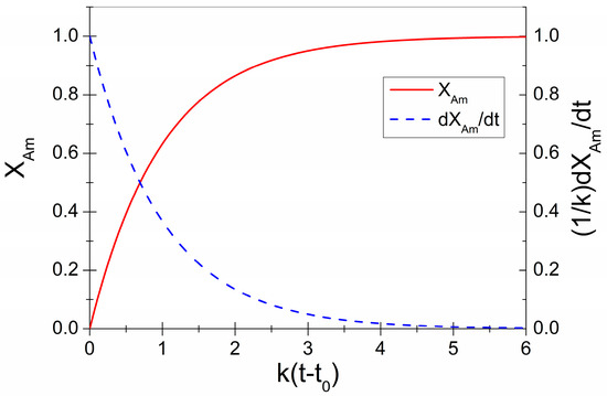 Examples for XAm curves are shown in Figure 7, and the results for the dXAm/dt curves are shown in Figure 8. The abscissa axis corresponds to the iteration steps multiplied by the fraction of the sample treated in those simulation steps in order to use a dimensionless parameter.