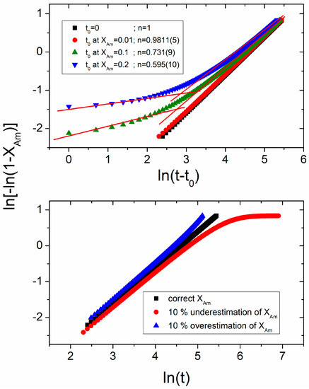 In order to study the effect of these artifacts, we generated XAm curves using the JMAK equation and a zero-induction time. These curves were analyzed using JMAK plots assuming different erroneous induction times or factors leading to the underestimation or overestimation of the transformed fraction. Figure 2 (upper panel) shows the effect of indetermination on the induction time in the JMAK plot for the case of n = 1. The effective Avrami exponent decreases and linearity gets worse as the overestimation of the induction time increases. The lower panel of Figure 2 shows the effect of a non-correct estimation of the transformed fraction. The underestimation of the transformed fraction also reduces neff. Strong deviations can yield an artificial two-slope behavior.