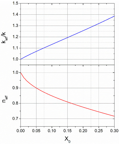 We generated different curves using Equation (7) with different values of X0, and n = 1 and t0 = 0. These curves were analyzed without considering a zero-starting fraction, i.e., using the conventional JMAK plot. The neff and effective frequency factor, keff, values are shown in Figure 3 as functions of X0. As an example, neff~0.8 for X0~0.15. For typical nanocrystal size of ~10 nm, this starting value will require an initial amorphous thickness of ~0.25 nm, which is approximately the atomic distance and thus, is too small to be detected. Such a small value is typical for coherent crystal boundary regions. Therefore, thicker boundaries, expected to be the nucleation sites of the amorphous phase, may have an even larger effect. This implies that difficulties in the early detection of transformation yield lower neff values than the actual values. In the case of keff, this parameter linearly increases with X0 (e.g., for X0 = 0.2, keff~1.25 k).