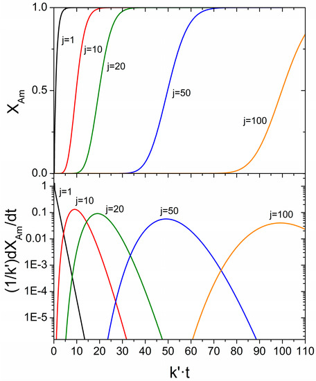 Except for the case where j = 1, an inflexion point at a time, tmax, exists in the XAm(t) curves. From the derivative of Equation (10), we can estimate the time taken to reach the maximum rate of transformation (i.e., the inflexion point of XAm(t)):