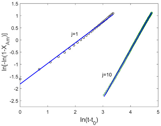 Using Equation (3), a plot of ln[−ln(1 − XAm)] vs ln(t − t0) (JMAK plot) allows us to obtain the values of n (from the slope) and k (from the intercept) after a fitting to a straight line.