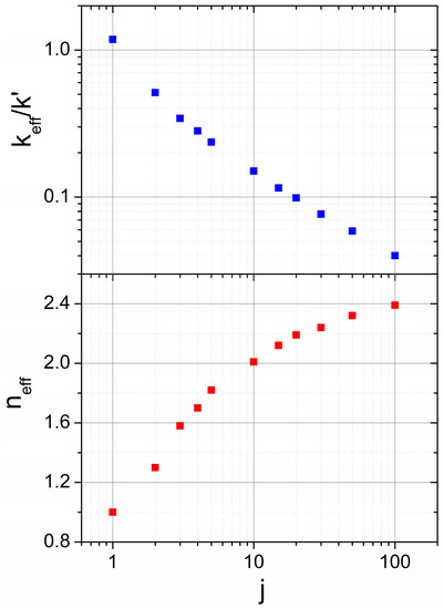 which allows us to obtain some information on the growth mechanism from keff. The red line in Figure 11 corresponds to Equation (16), and a rather good agreement can be found despite the different approximations required.