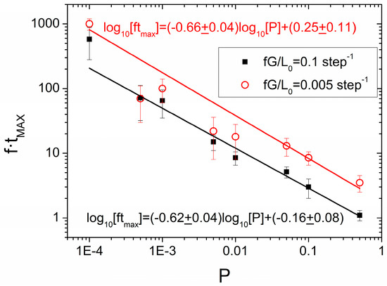 Time taken for the maximum dXAm/dt from the simulations to occur as a function of the probability of nucleation. The solid lines are the linear fitted data.
